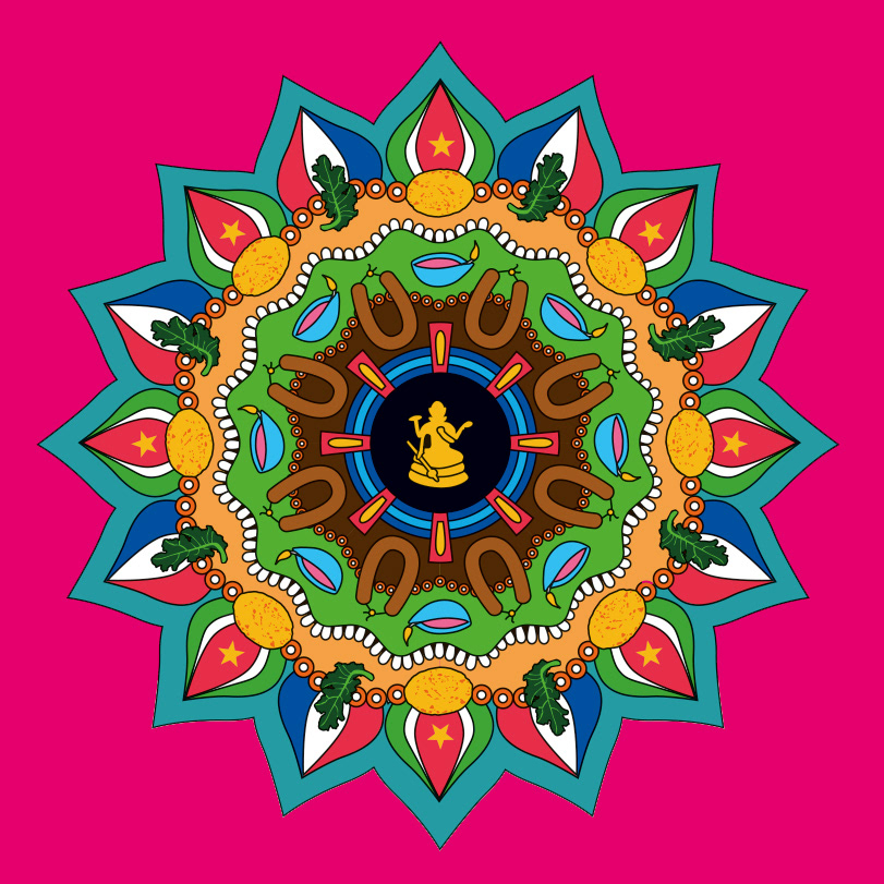 Op de omslag van deze jeugdroman over de Hindoestaans-Surinaamse geschiedenis staan ornamenten met daarin wat ingrediënten uit de titel.